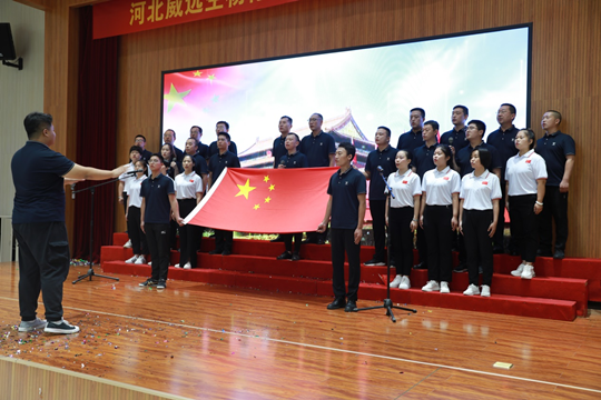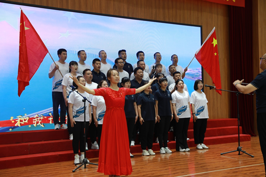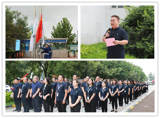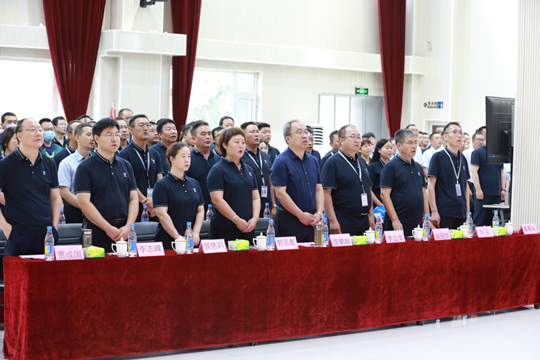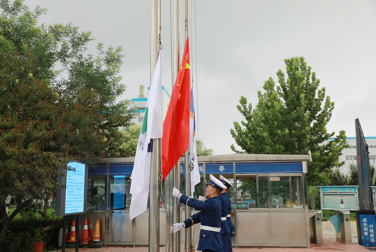 2022年7月26日上午8點08分,一場隆重的升旗儀式拉開了慶典活動的帷幕,黨委副書記王興武主持升旗儀式,升旗手護(hù)送國旗、司旗入場,全場人行注目禮,隨著高亢的國歌聲,三面旗幟緩緩上升,在朝陽中迎風(fēng)飄揚(yáng)。