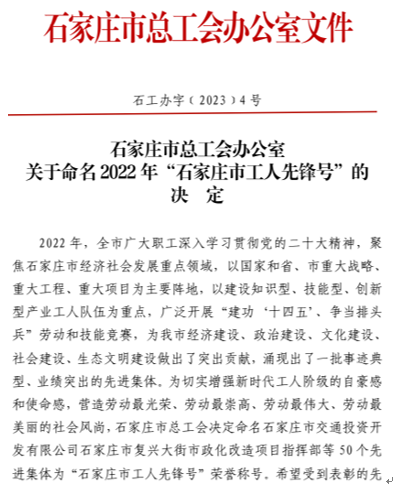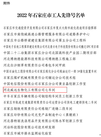 新年傳喜訊,近日,石家莊市總工會辦公室下發(fā)《關(guān)于命名 2022 年“石家莊市工人先鋒號”的決定》,河北威遠(yuǎn)生物化工有限公司七車間在2022年石家莊市“工人先鋒號”評選中成功入圍,榮獲“石家莊市工人先鋒號”稱號。