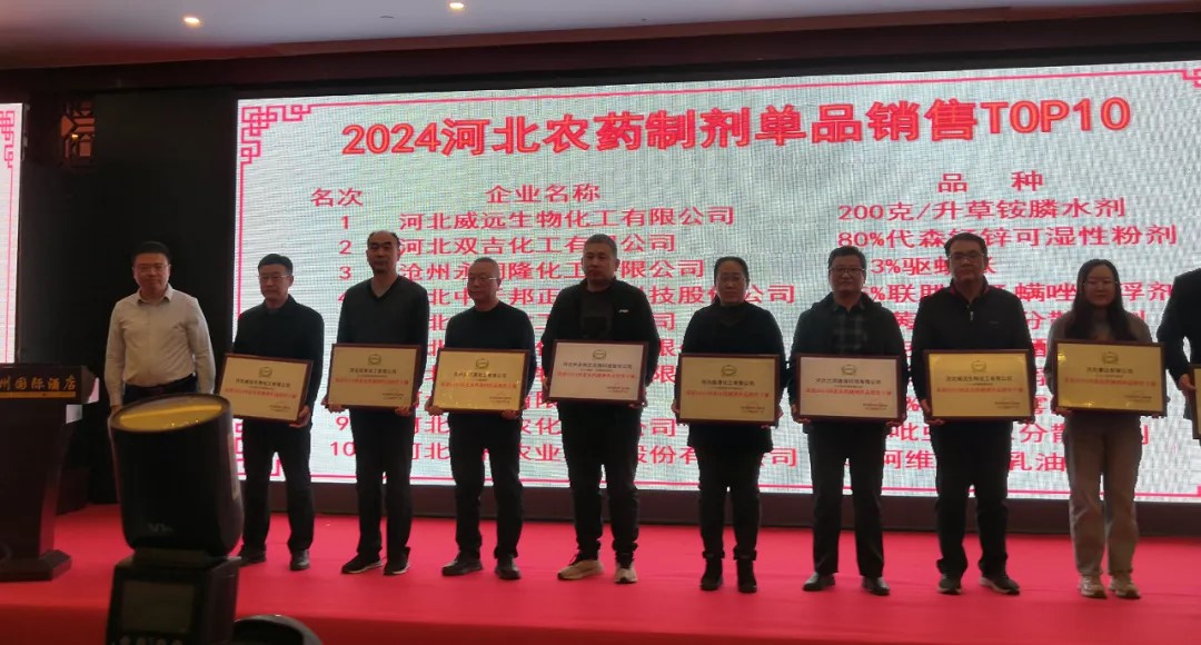 大會(huì)發(fā)布了“2024河北農(nóng)藥銷(xiāo)售收入TOP10、2024河北農(nóng)藥出口銷(xiāo)售收入TOP10、2024河北農(nóng)藥制劑單品銷(xiāo)售TOP10等榜單,利民股份子公司威遠(yuǎn)生化、雙吉化工分別榮獲河北農(nóng)藥銷(xiāo)售收入、出口銷(xiāo)售十強(qiáng)企業(yè)榮譽(yù)。利民股份產(chǎn)品200克/升草銨膦水劑、80%代森錳鋅可濕性粉劑、1.8%阿維菌素乳油分別榮獲河北省制劑單品銷(xiāo)售十強(qiáng)榮譽(yù)稱(chēng)號(hào)。